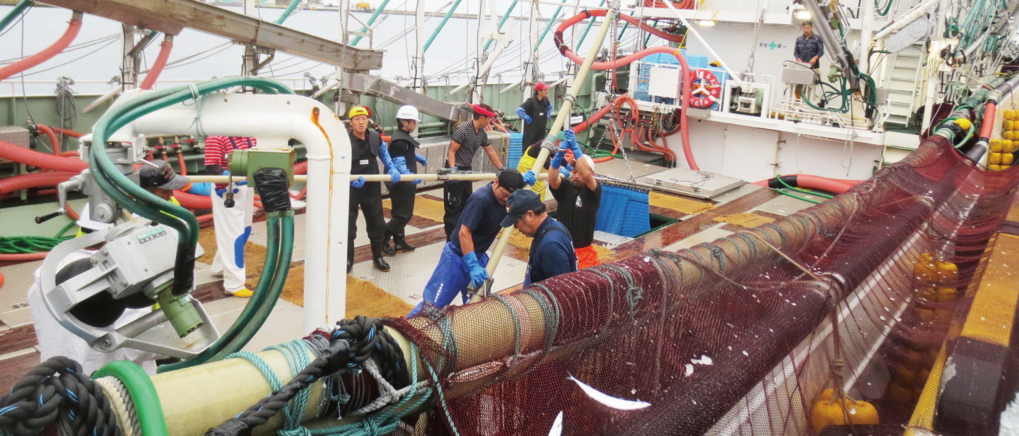 魚の群れを取り囲むように網を入れ、網の下側を締めて漁獲する漁法です。